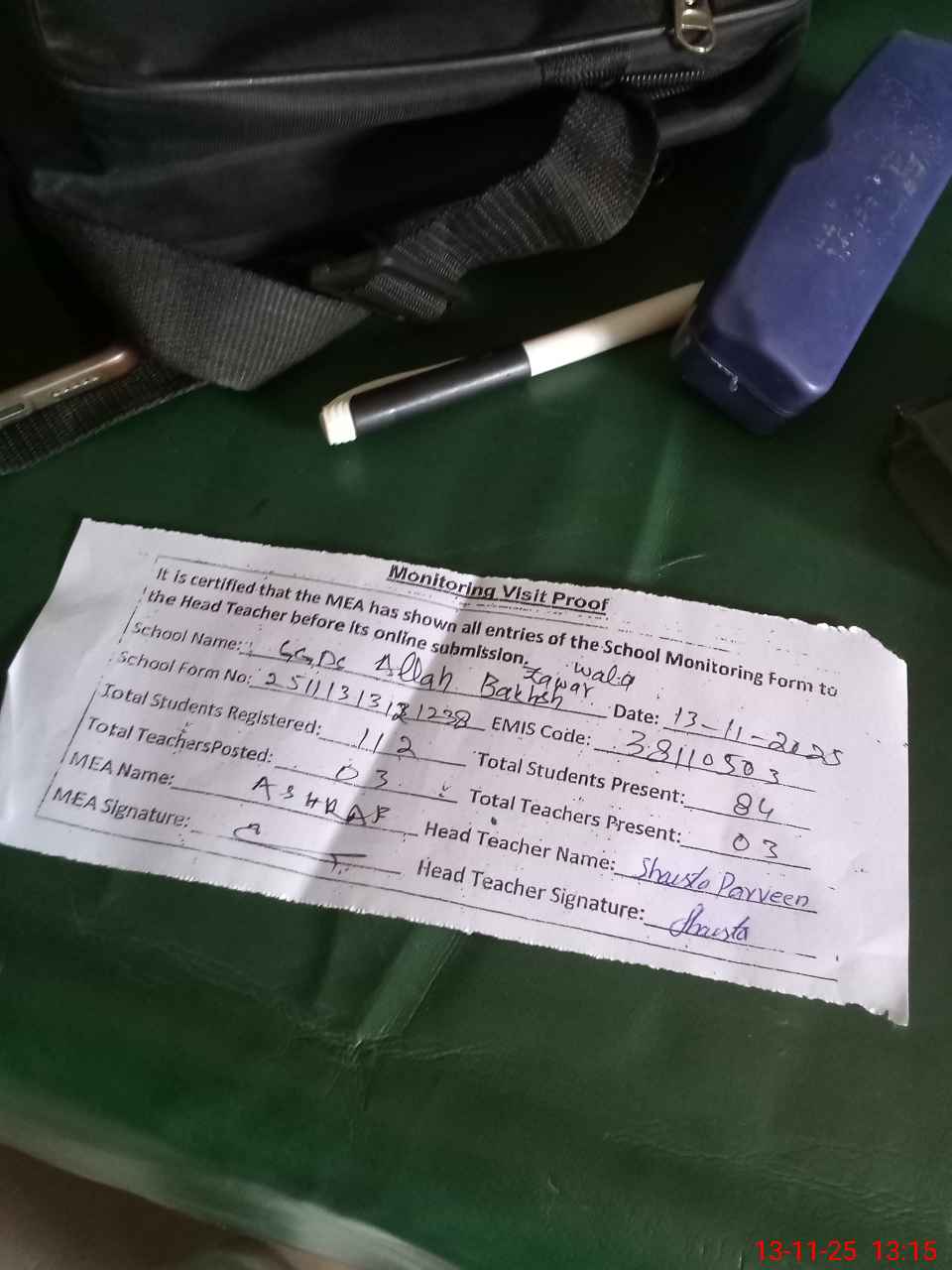 | Attendance Register | Head Teacher | MEA with School | Visit Proof |