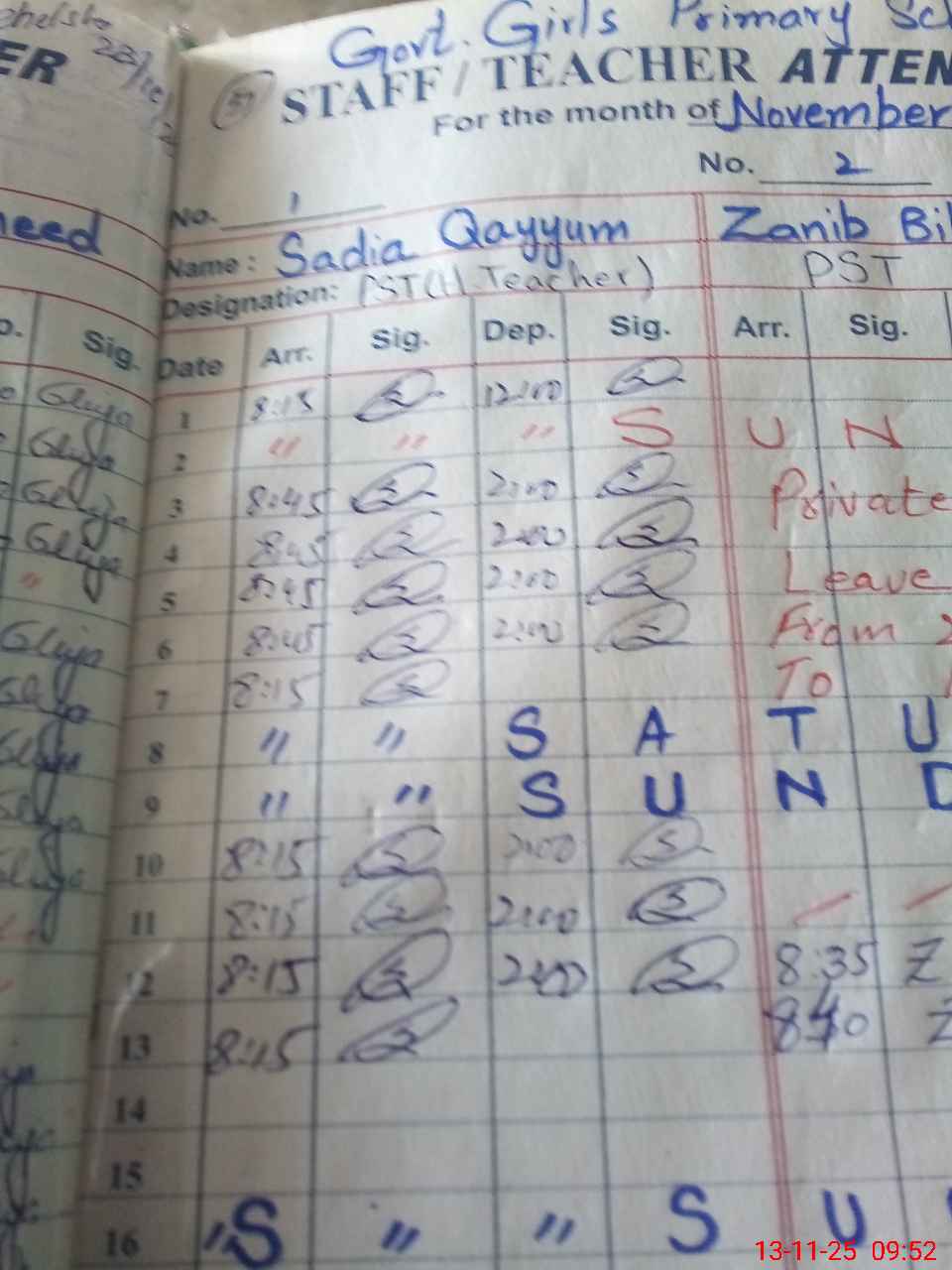 | CNIC | Full Name | Designation | R/C | Absence During Last Calender Month |