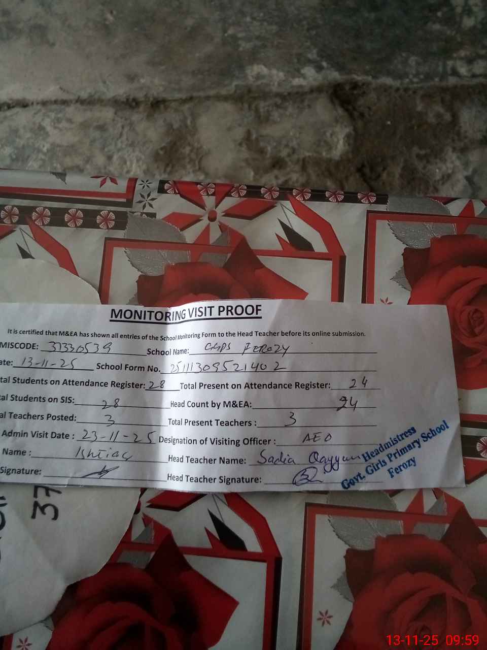 | Attendance Register | Head Teacher | MEA with School | Visit Proof |