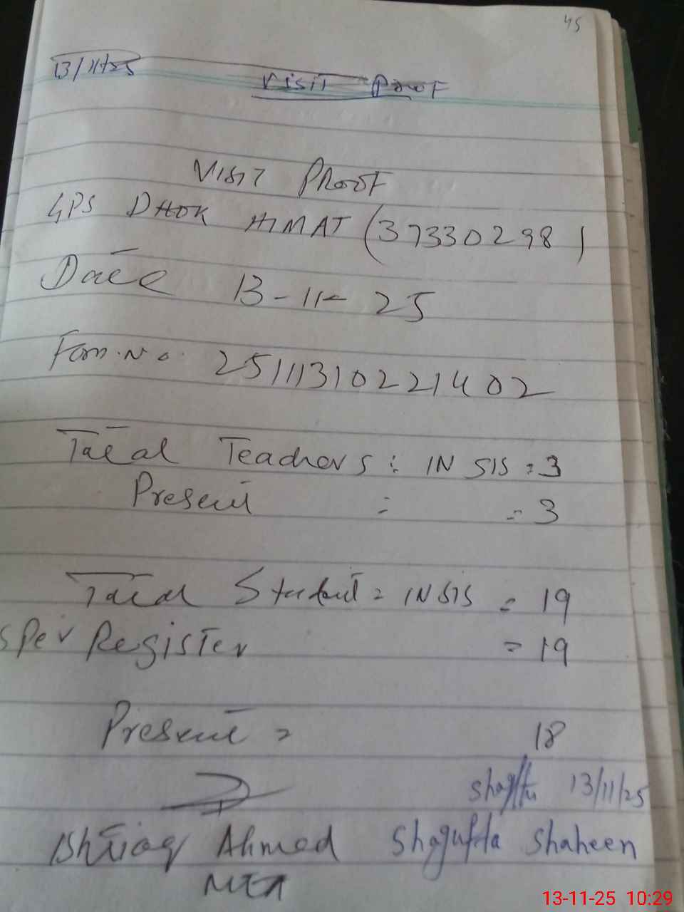 | Attendance Register | Head Teacher | MEA with School | Visit Proof |