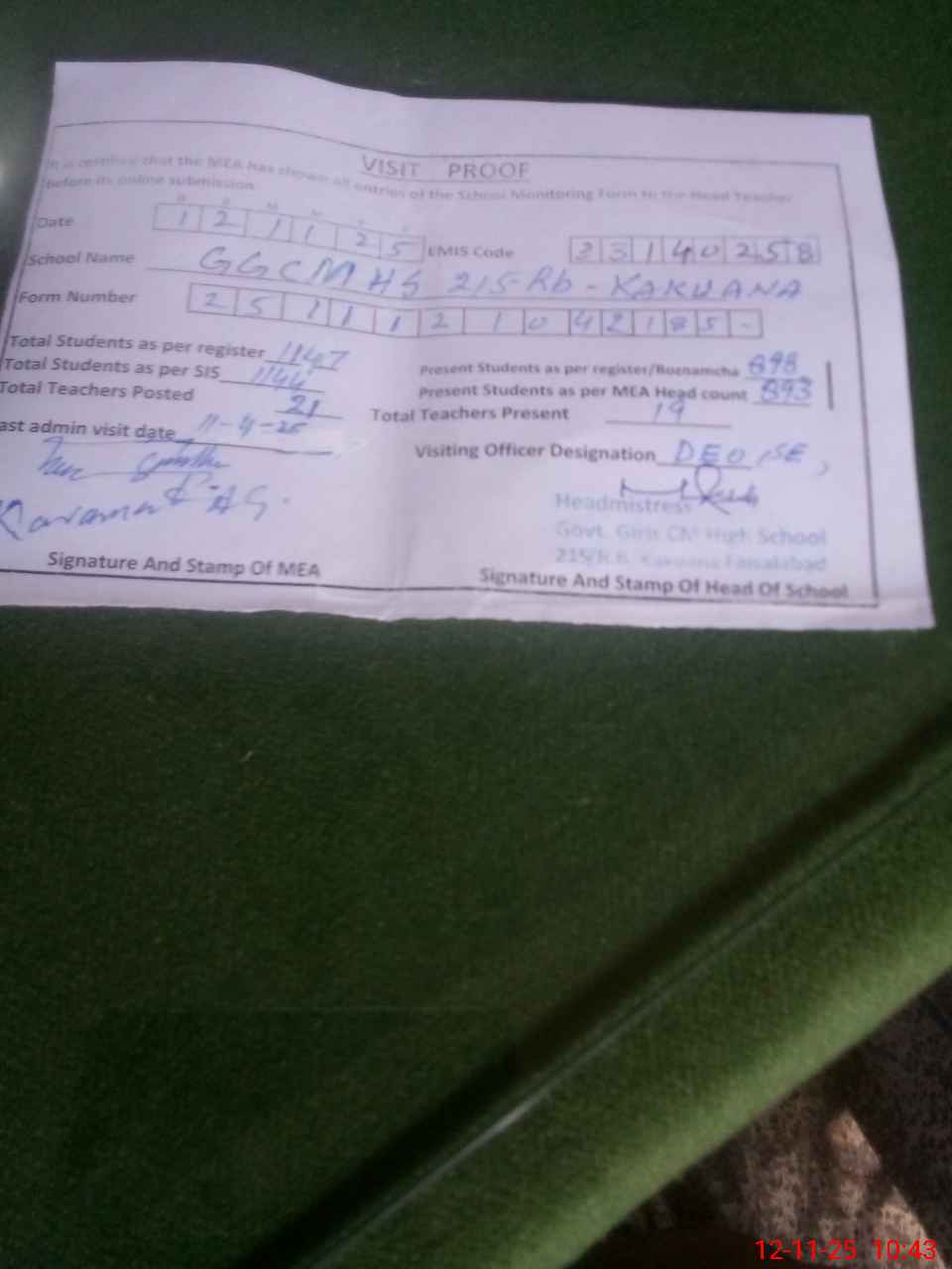 | Certified that this School was Inspected by the Undersigned MEA/DMO Today and the Information Stated Above is as Per Record. | |||||