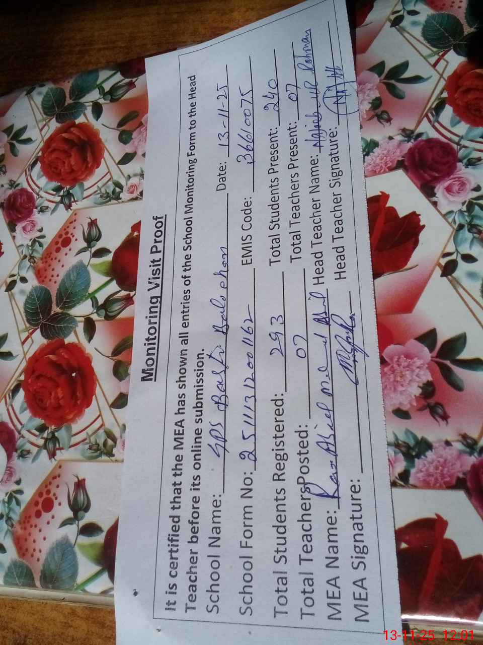 | Attendance Register | Head Teacher | MEA with School | Visit Proof |