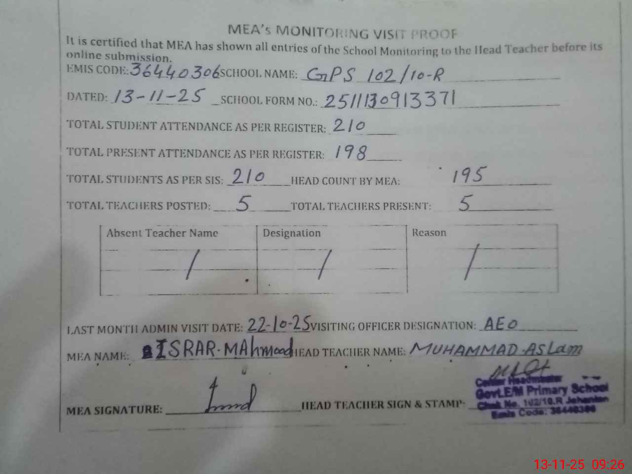 | Attendance Register | Head Teacher | MEA with School | Visit Proof |