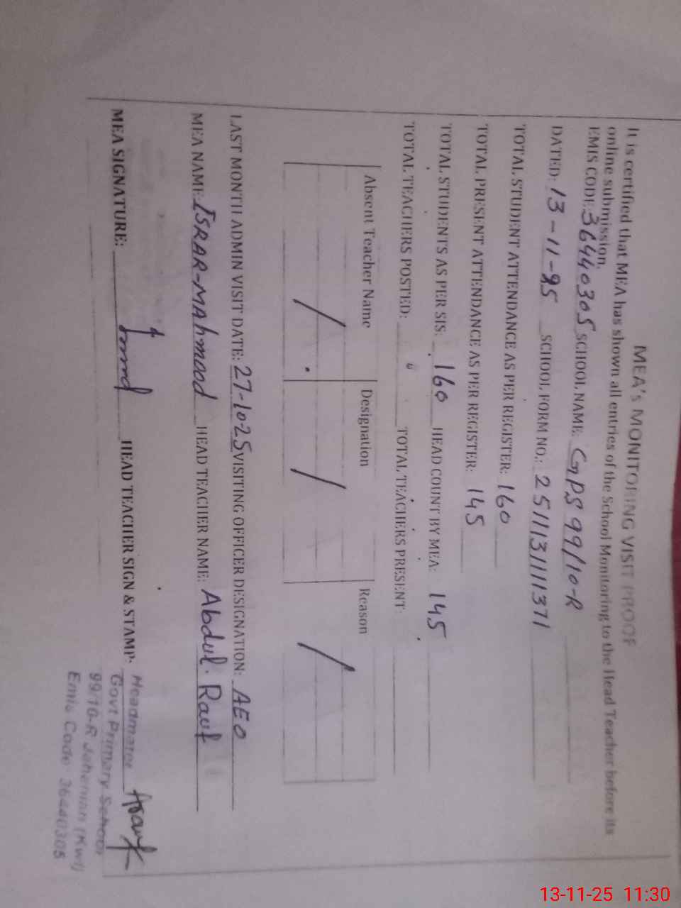 | Attendance Register | Head Teacher | MEA with School | Visit Proof |