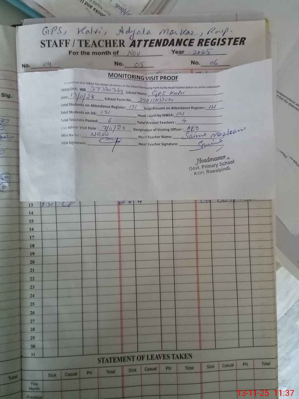 | Attendance Register | Head Teacher | MEA with School | Visit Proof |
