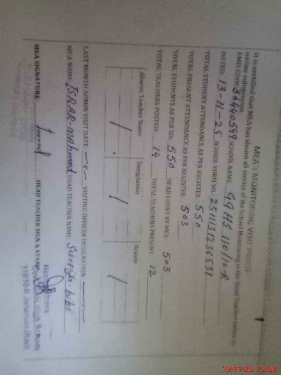 | Attendance Register | Head Teacher | MEA with School | Visit Proof |