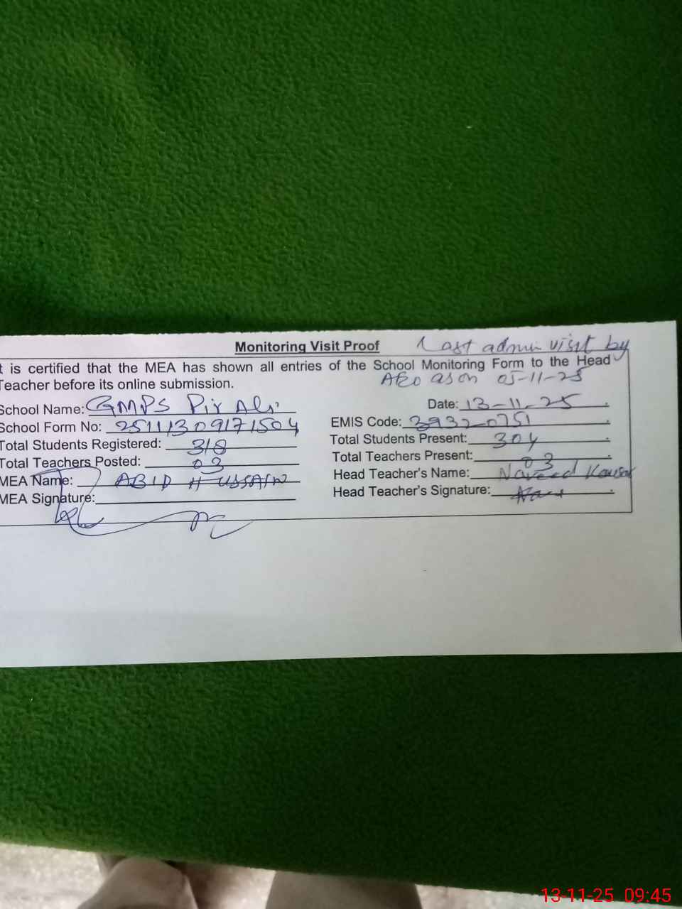 | Attendance Register | Head Teacher | MEA with School | Visit Proof |