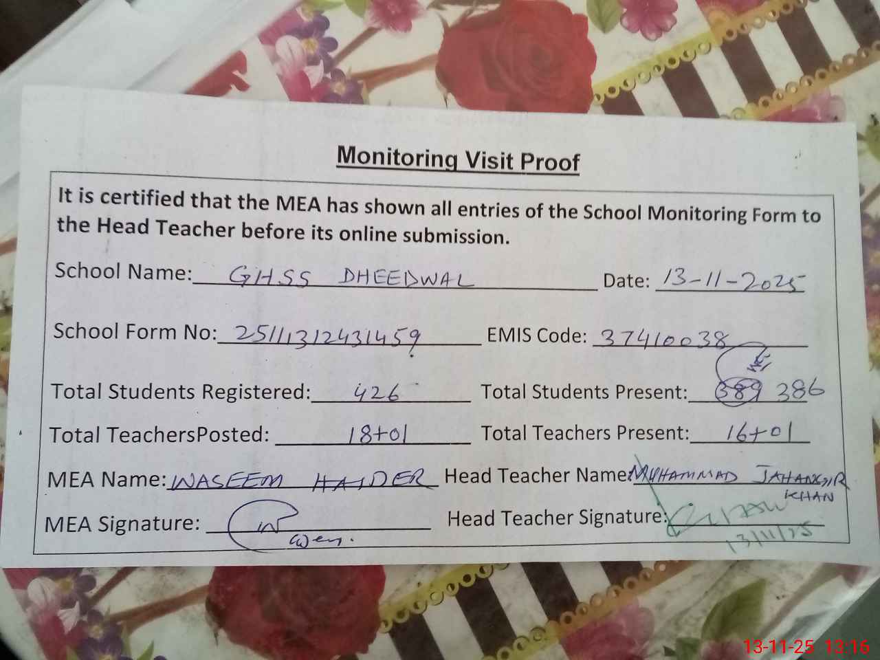 | Attendance Register | Head Teacher | MEA with School | Visit Proof |
