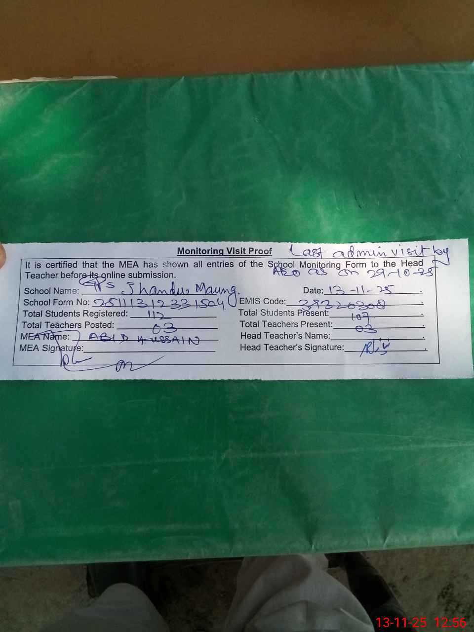 | Attendance Register | Head Teacher | MEA with School | Visit Proof |