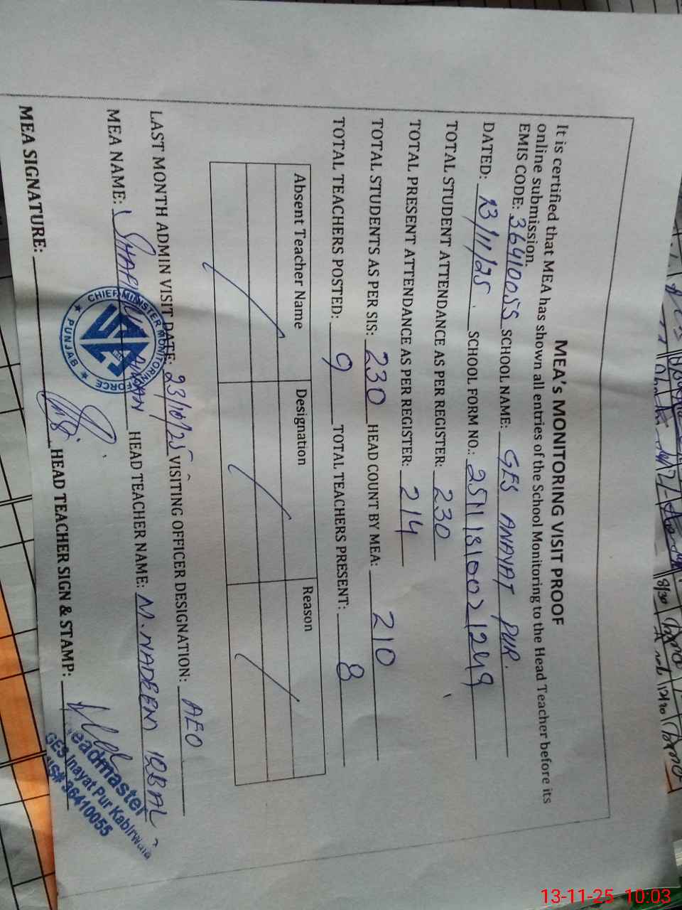 | Attendance Register | Head Teacher | MEA with School | Visit Proof |