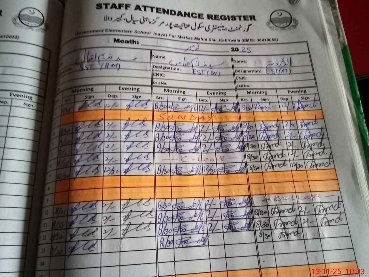 | CNIC | Full Name | Designation | R/C | Absence During Last Calender Month |