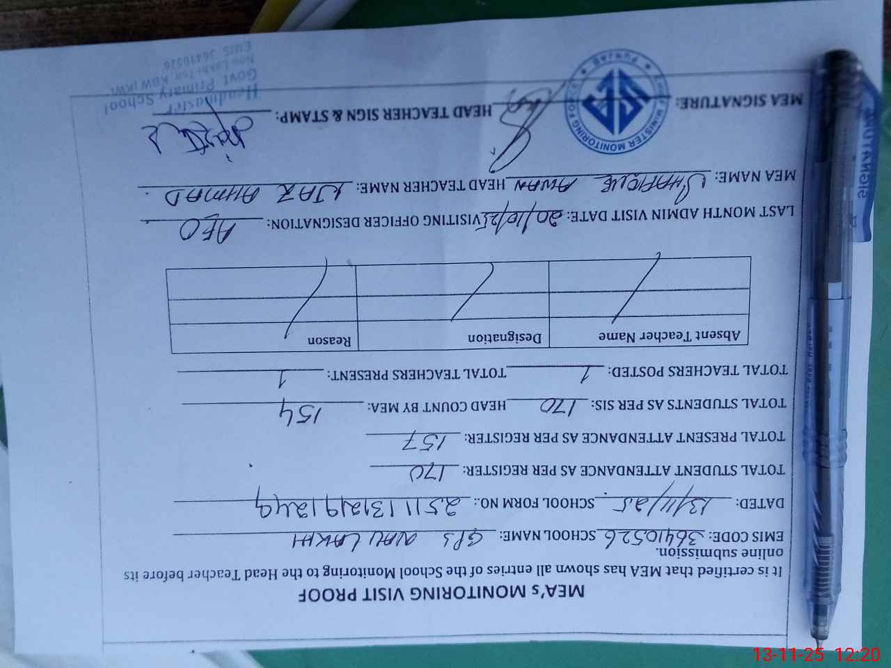 | Attendance Register | Head Teacher | MEA with School | Visit Proof |
