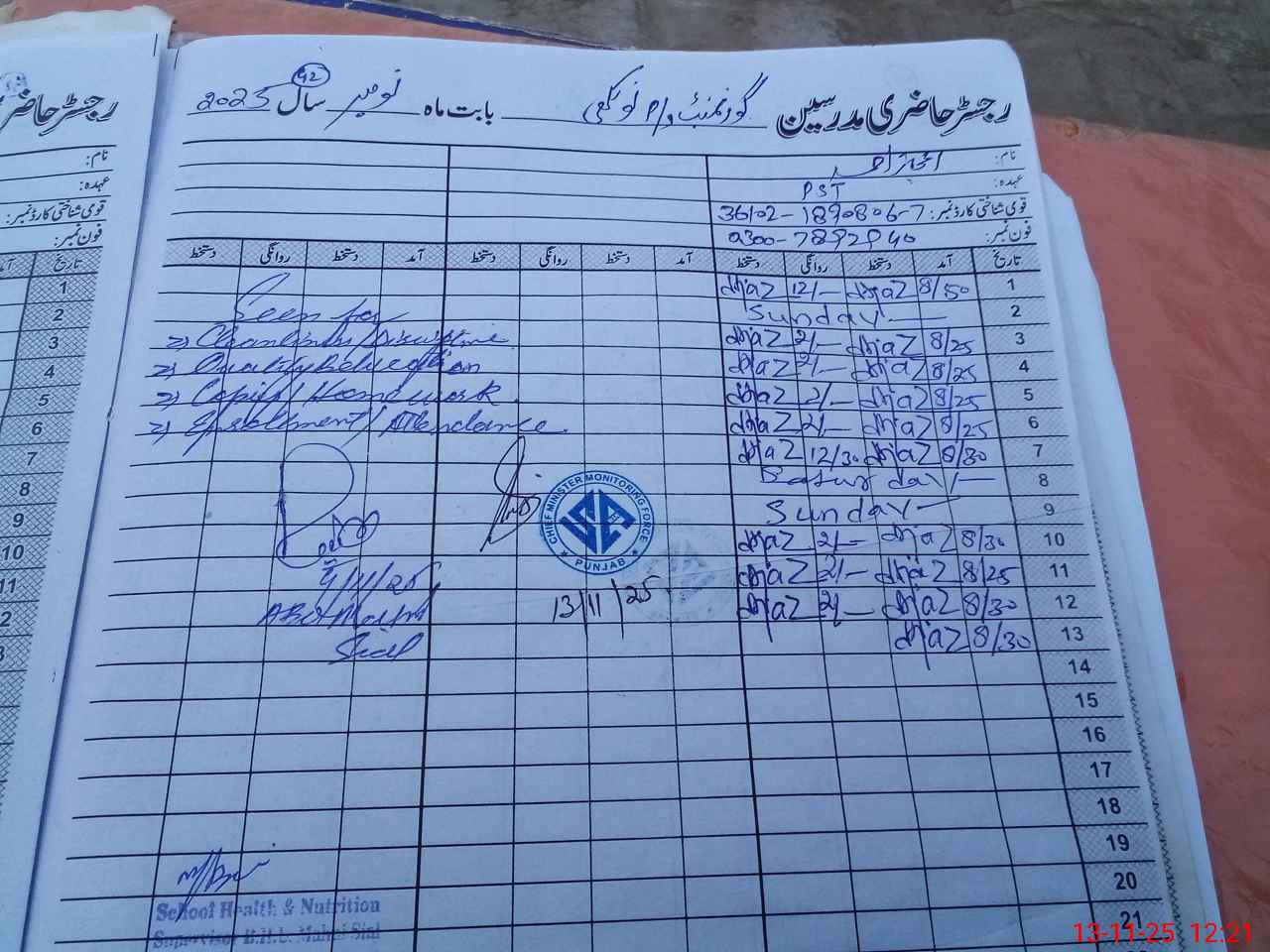 | CNIC | Full Name | Designation | R/C | Absence During Last Calender Month |