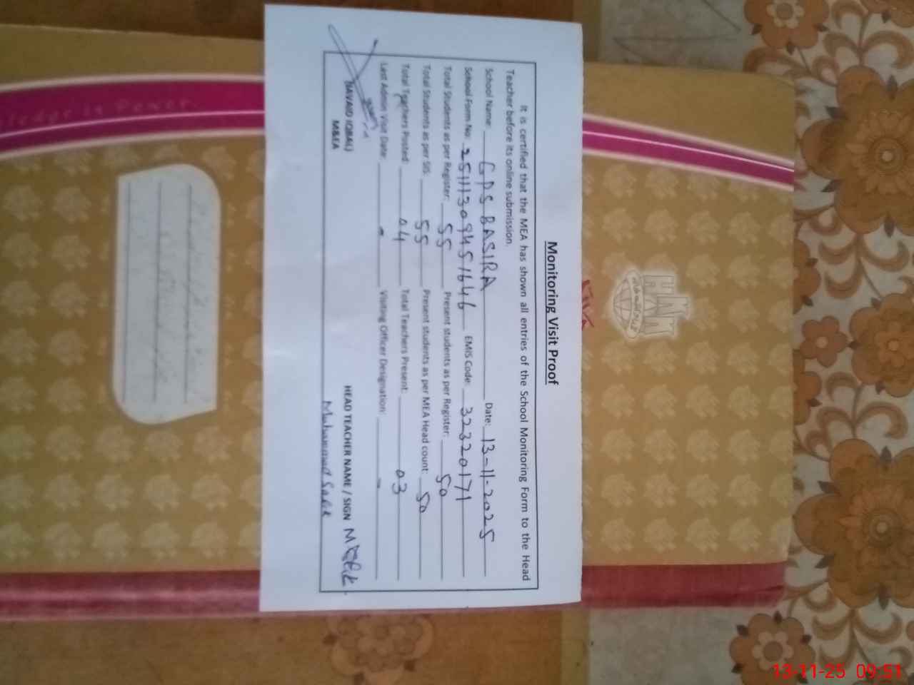 | Attendance Register | Head Teacher | MEA with School | Visit Proof |