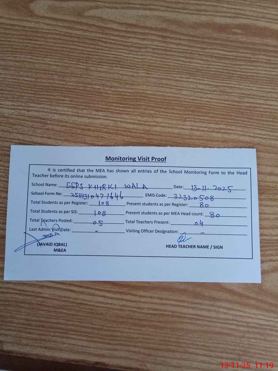 | EMIS Code: 32320508 | Name of School: GGPS KHIRKI WALA | |||