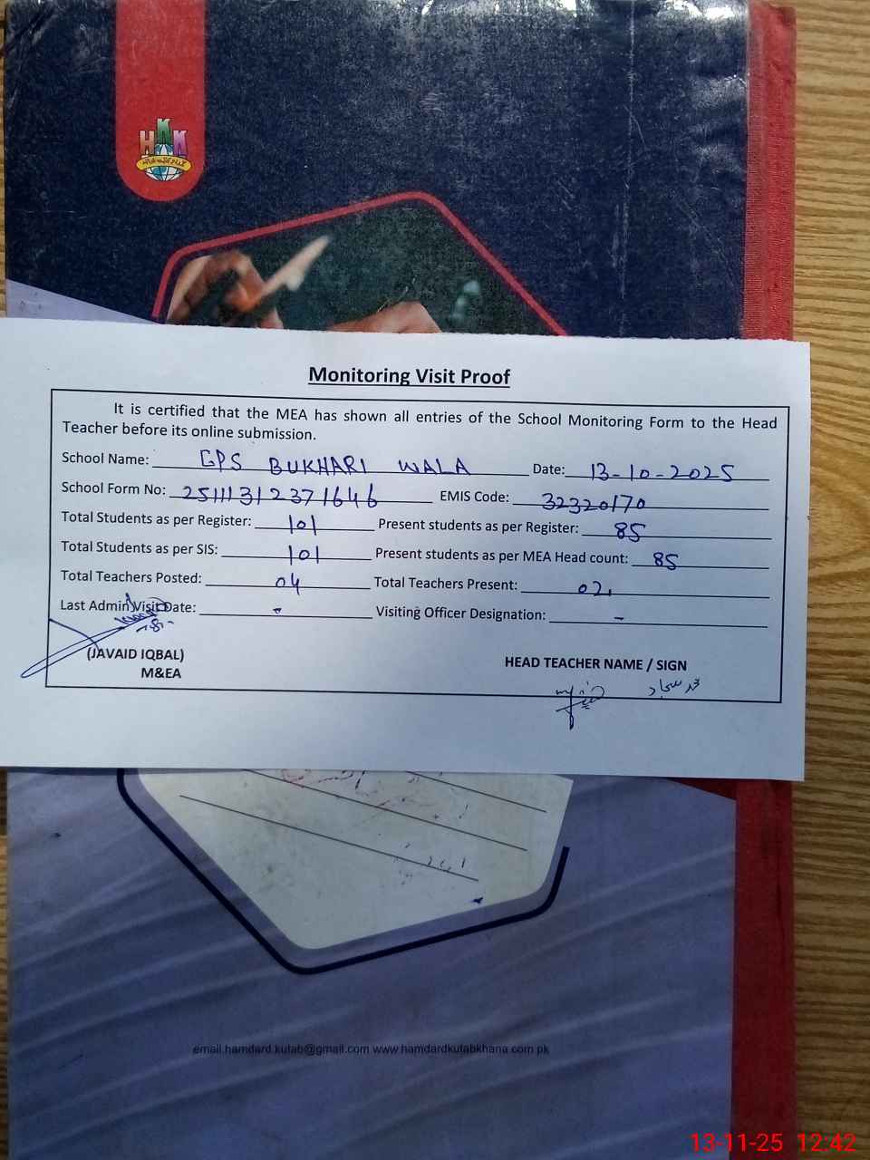 | Attendance Register | Head Teacher | MEA with School | Visit Proof |
