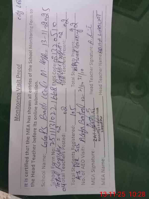 | Attendance Register | Head Teacher | MEA with School | Visit Proof |