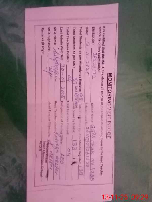 | EMIS Code: 38220172 | Name of School: GGPS CHAK NO. 42/DB | |||