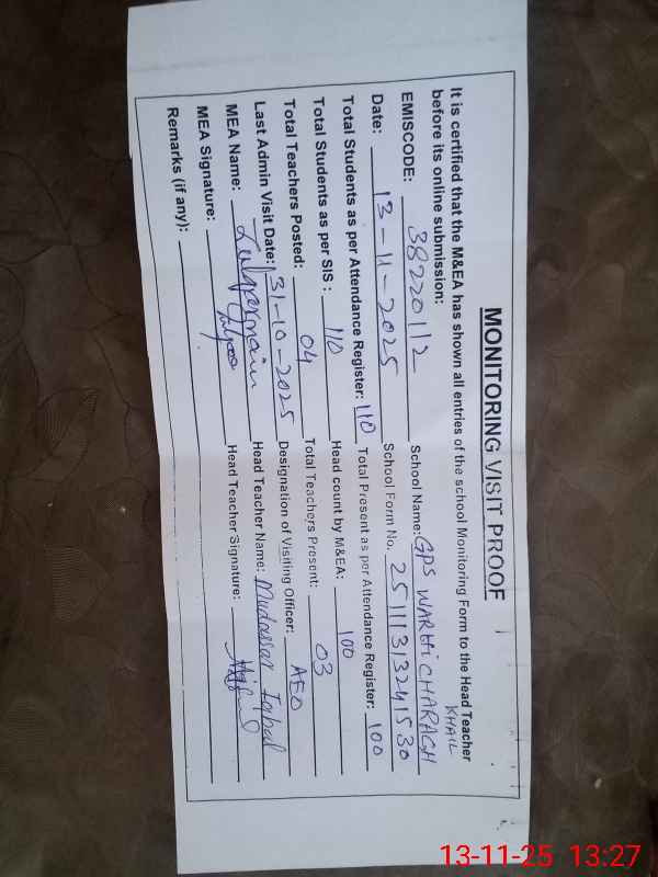 | EMIS Code: 38220112 | Name of School: GPS WARI CHARAGH KHAIL | |||