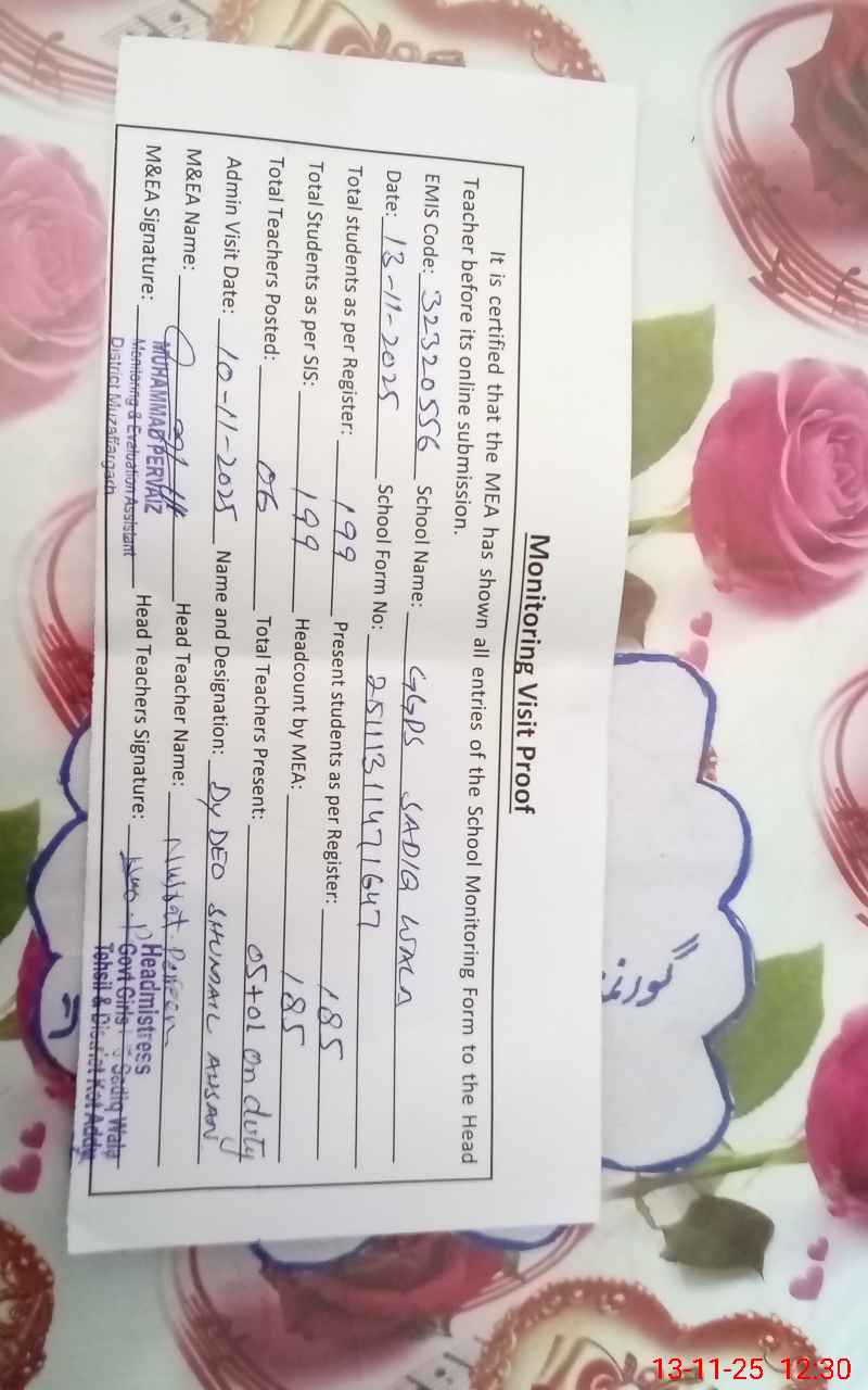 | EMIS Code: 32320556 | Name of School: GGPS SADIQ WALA | |||