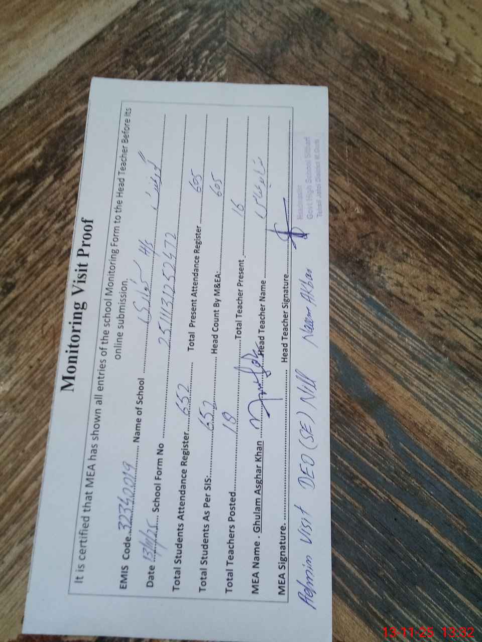 | Attendance Register | Head Teacher | MEA with School | Visit Proof |