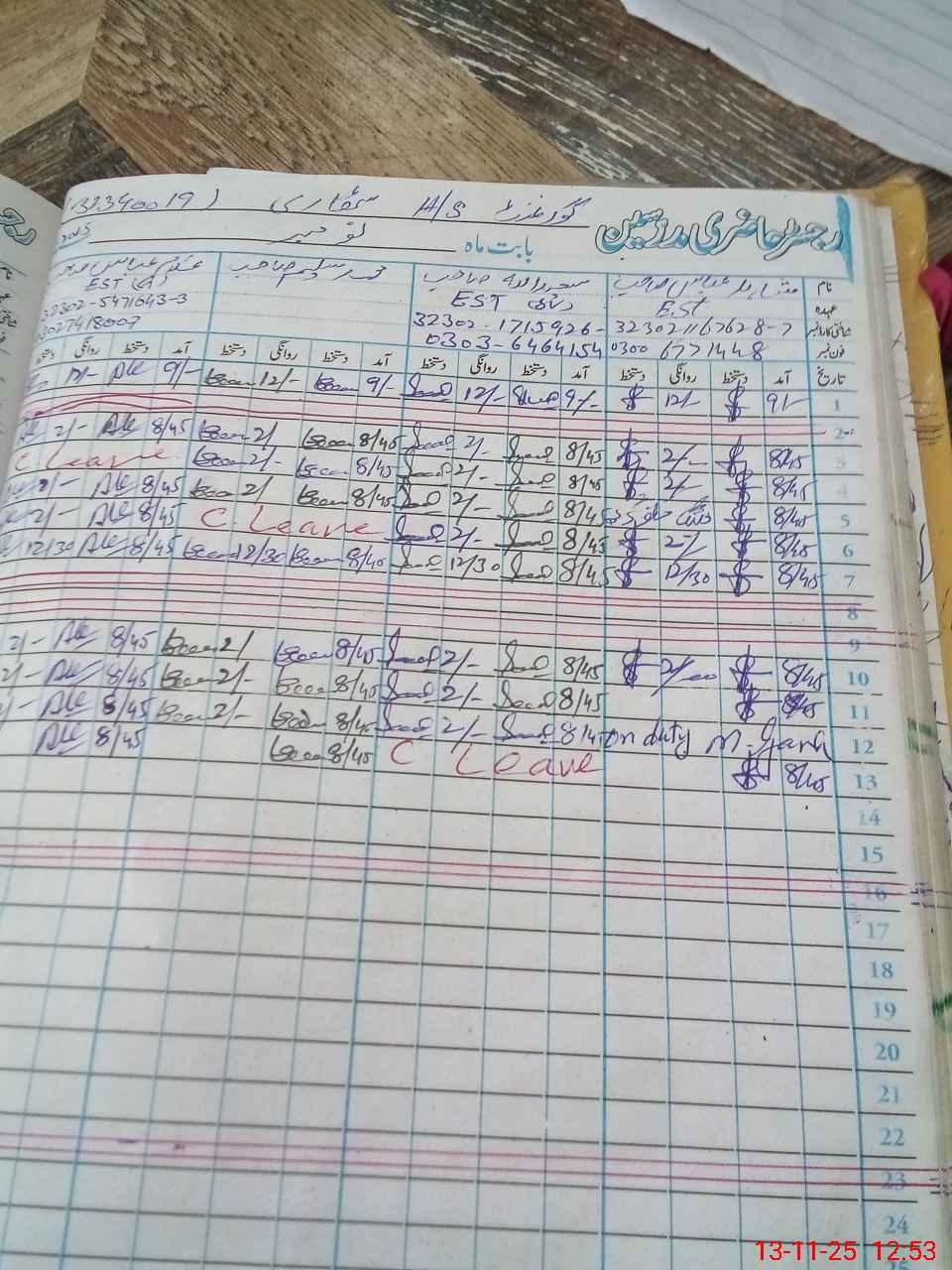 | CNIC | Full Name | Designation | R/C | Absence During Last Calender Month |