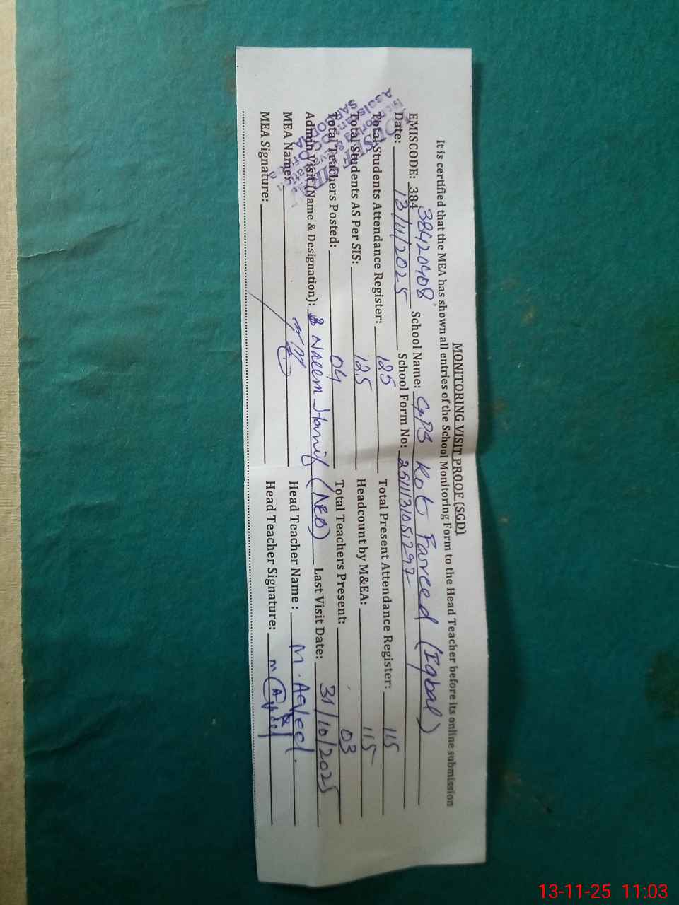 | Attendance Register | Head Teacher | MEA with School | Visit Proof |