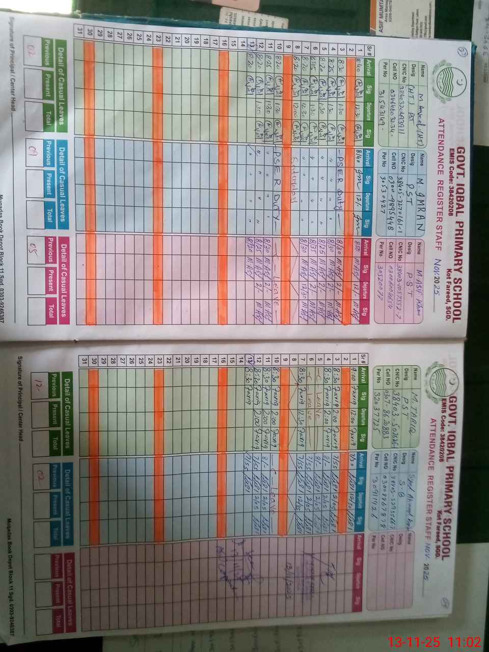 | CNIC | Full Name | Designation | R/C | Absence during last cal. month |