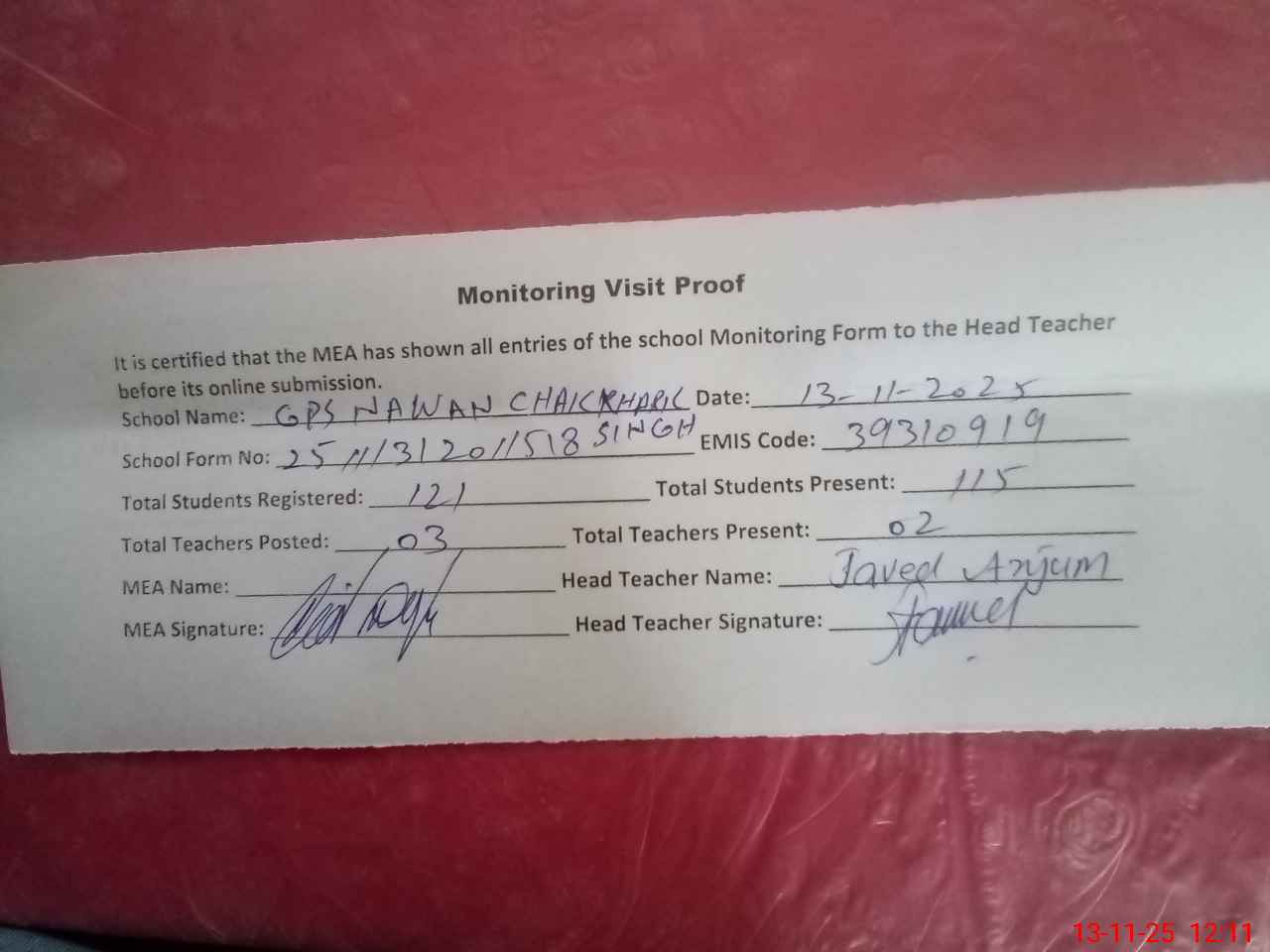 | Attendance Register | Head Teacher | MEA with School | Visit Proof |
