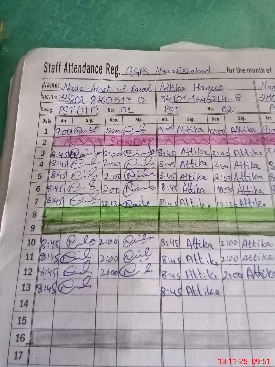 | CNIC | Full Name | Designation | R/C | Absence During Last Calender Month |