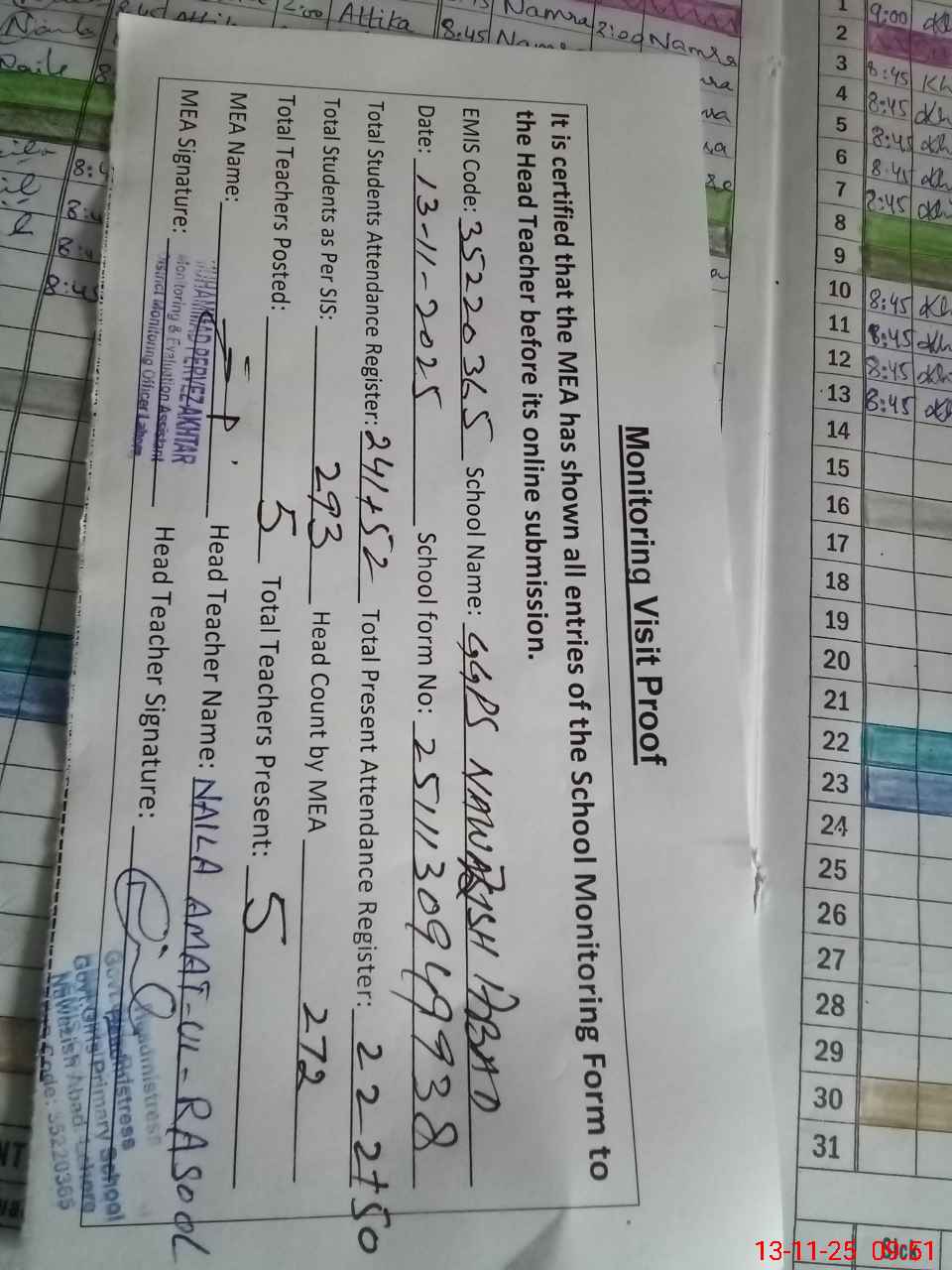 | Attendance Register | Head Teacher | MEA with School | Visit Proof |