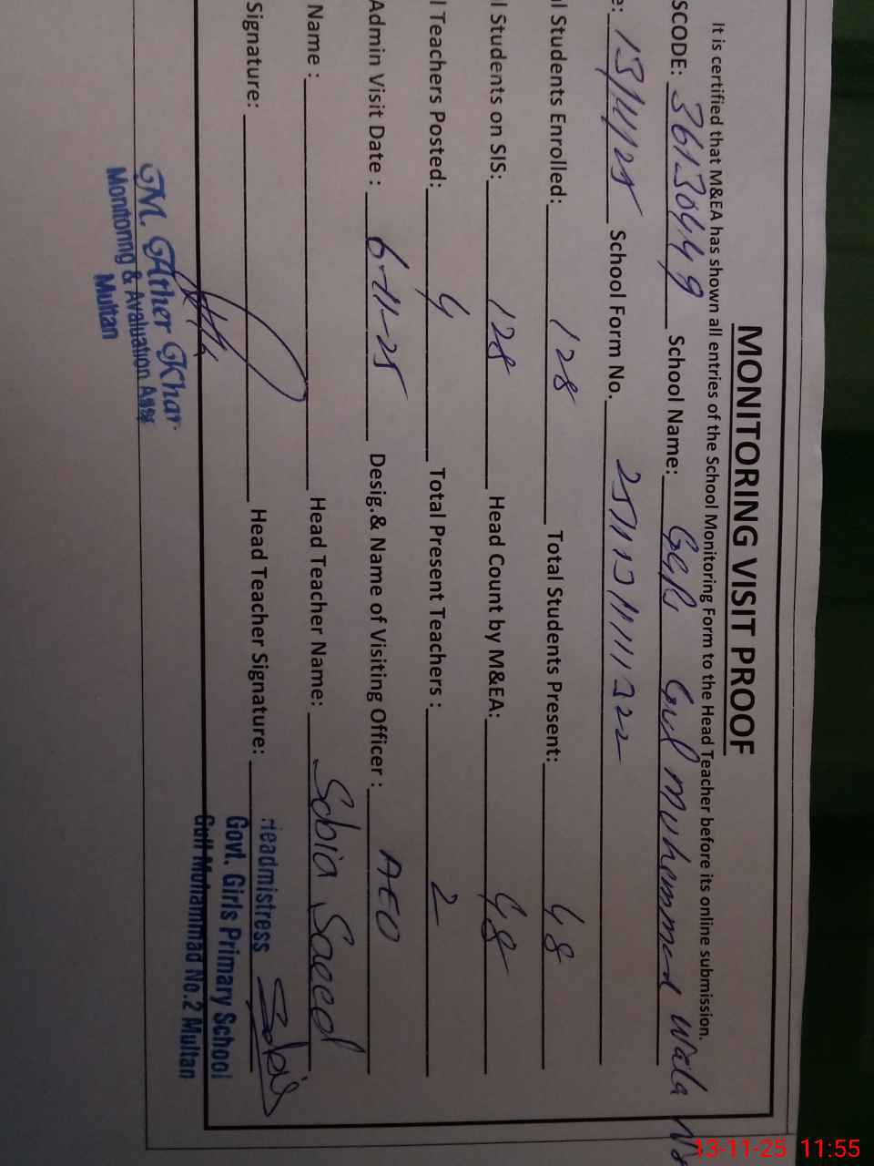 | EMIS Code: 36130449 | Name of School: GGPS GUL MUHAMMAD NO 2 MULTAN | |||