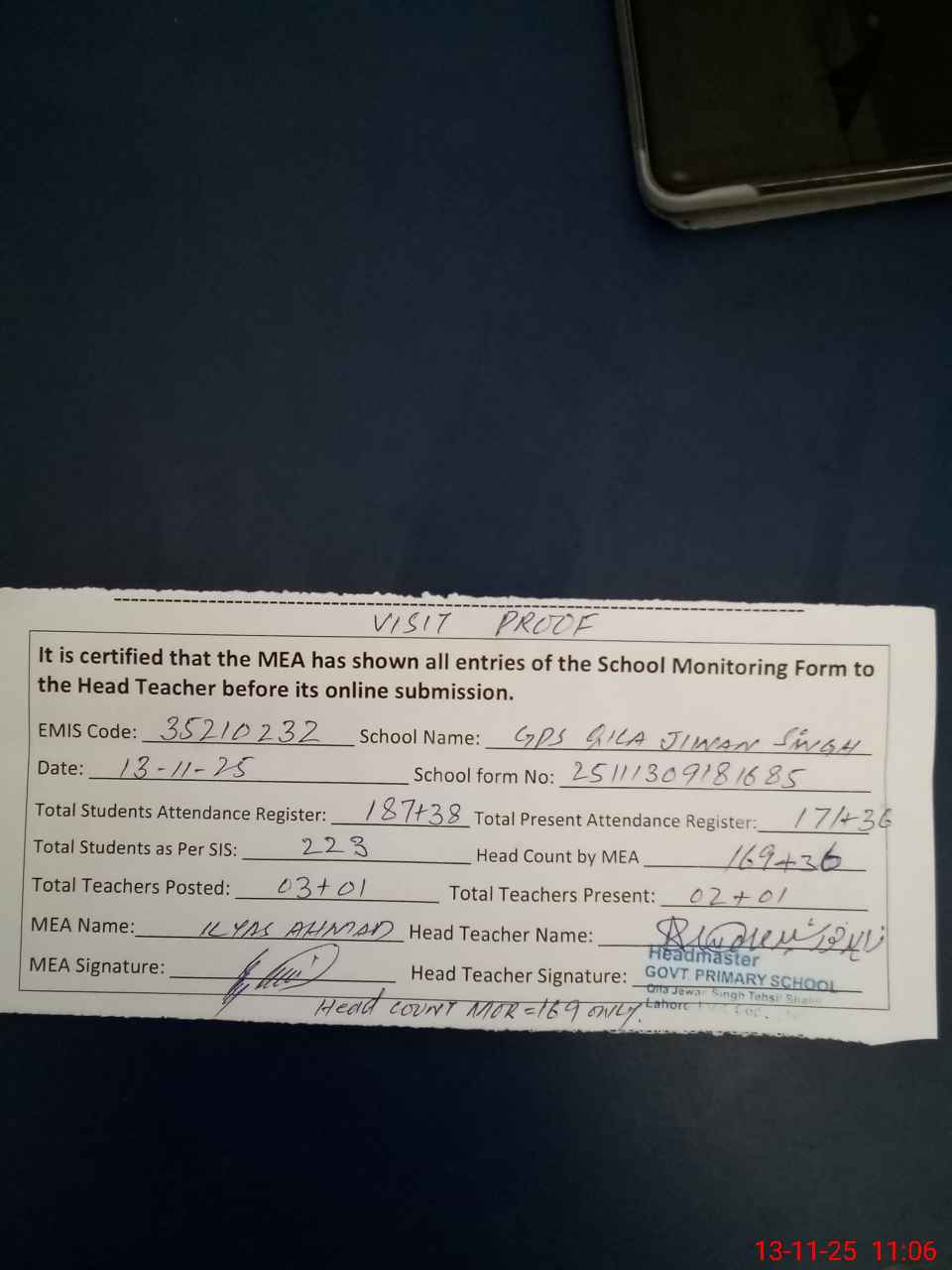 | Attendance Register | Head Teacher | MEA with School | Visit Proof |