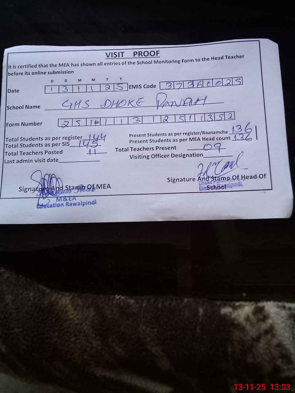 | Attendance Register | Head Teacher | MEA with School | Visit Proof |