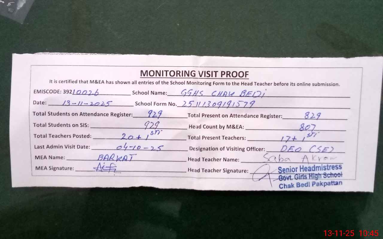 | EMIS Code: 39210026 | Name of School: GGHS CHAK BEDI | |||