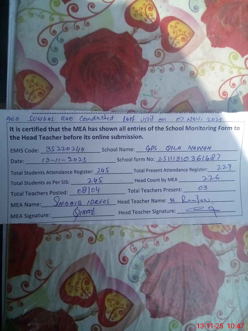 | Attendance Register | Head Teacher | MEA with School | Visit Proof |