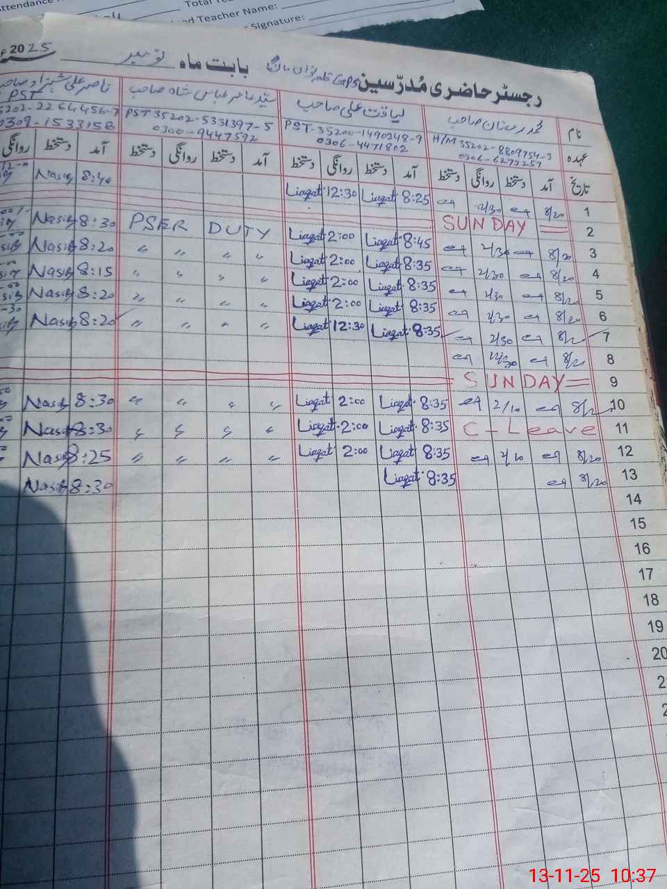 | CNIC | Full Name | Designation | R/C | Absence During Last Calender Month |