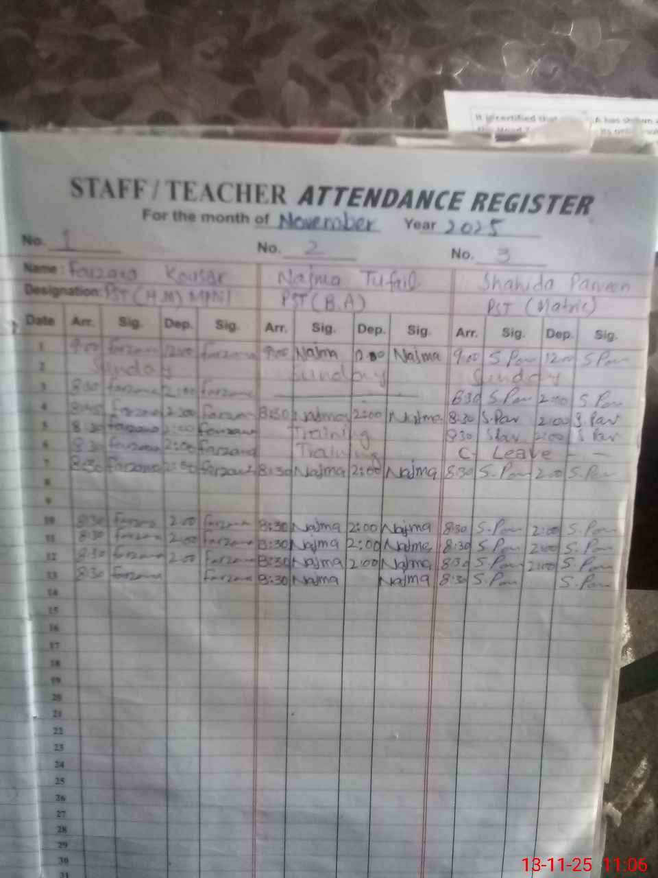 | CNIC | Full Name | Designation | R/C | Absence During Last Calender Month |