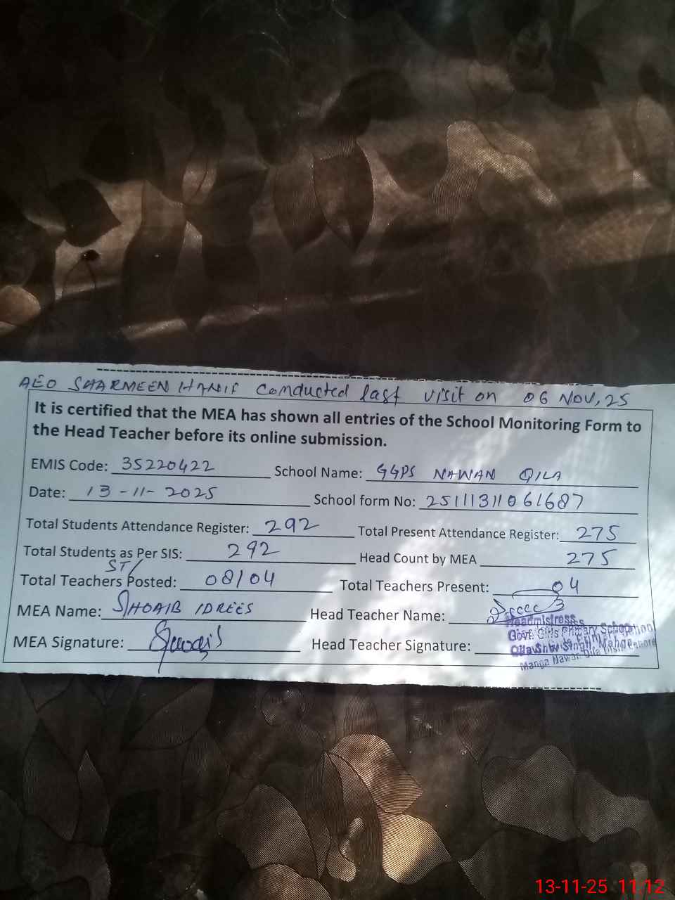 | Attendance Register | Head Teacher | MEA with School | Visit Proof |