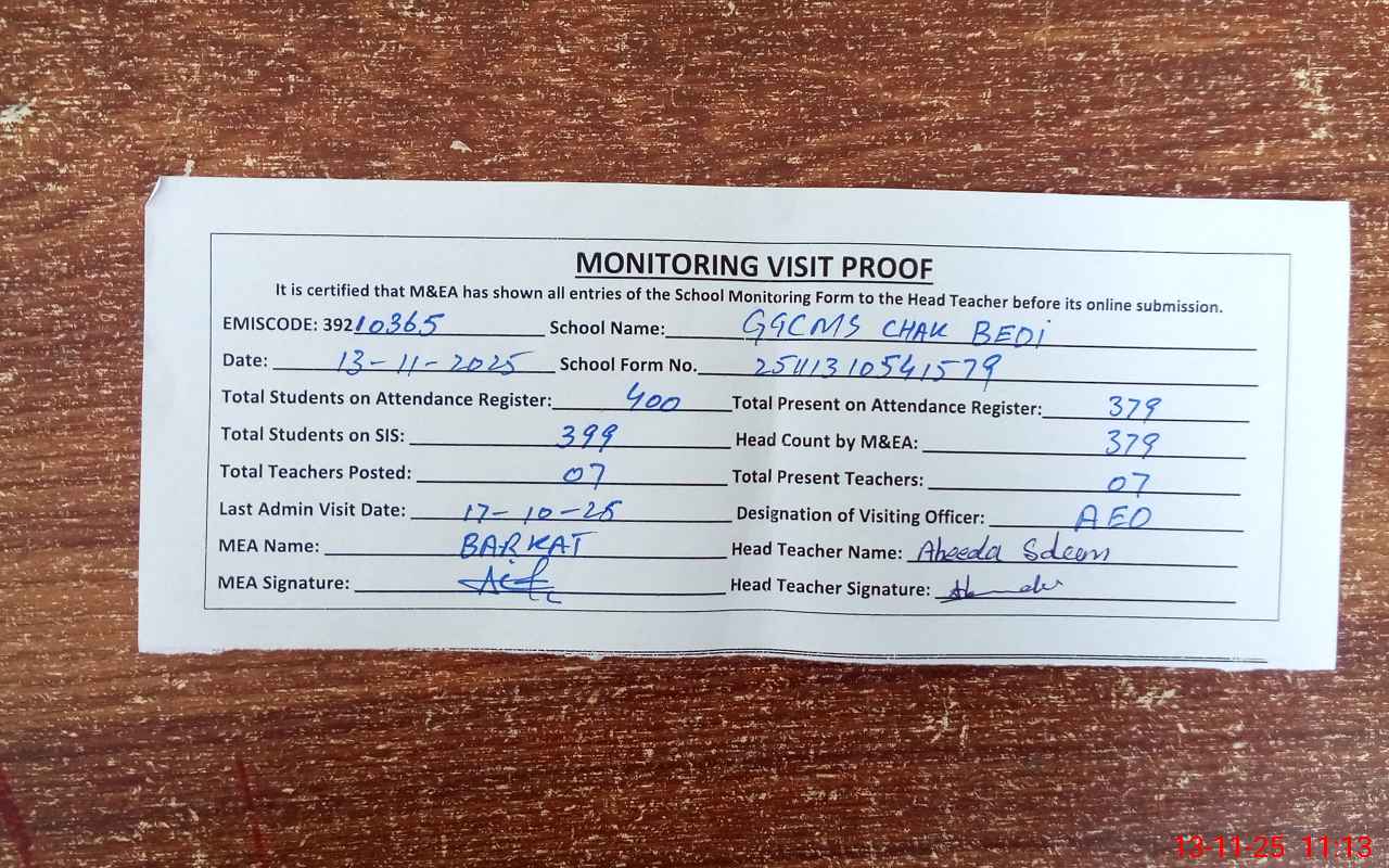 | EMIS Code: 39210365 | Name of School: GGCMS CHAK BEDI | |||