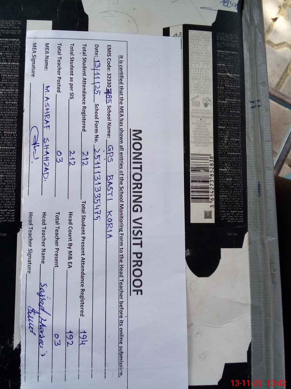 | Attendance Register | Head Teacher | MEA with School | Visit Proof |