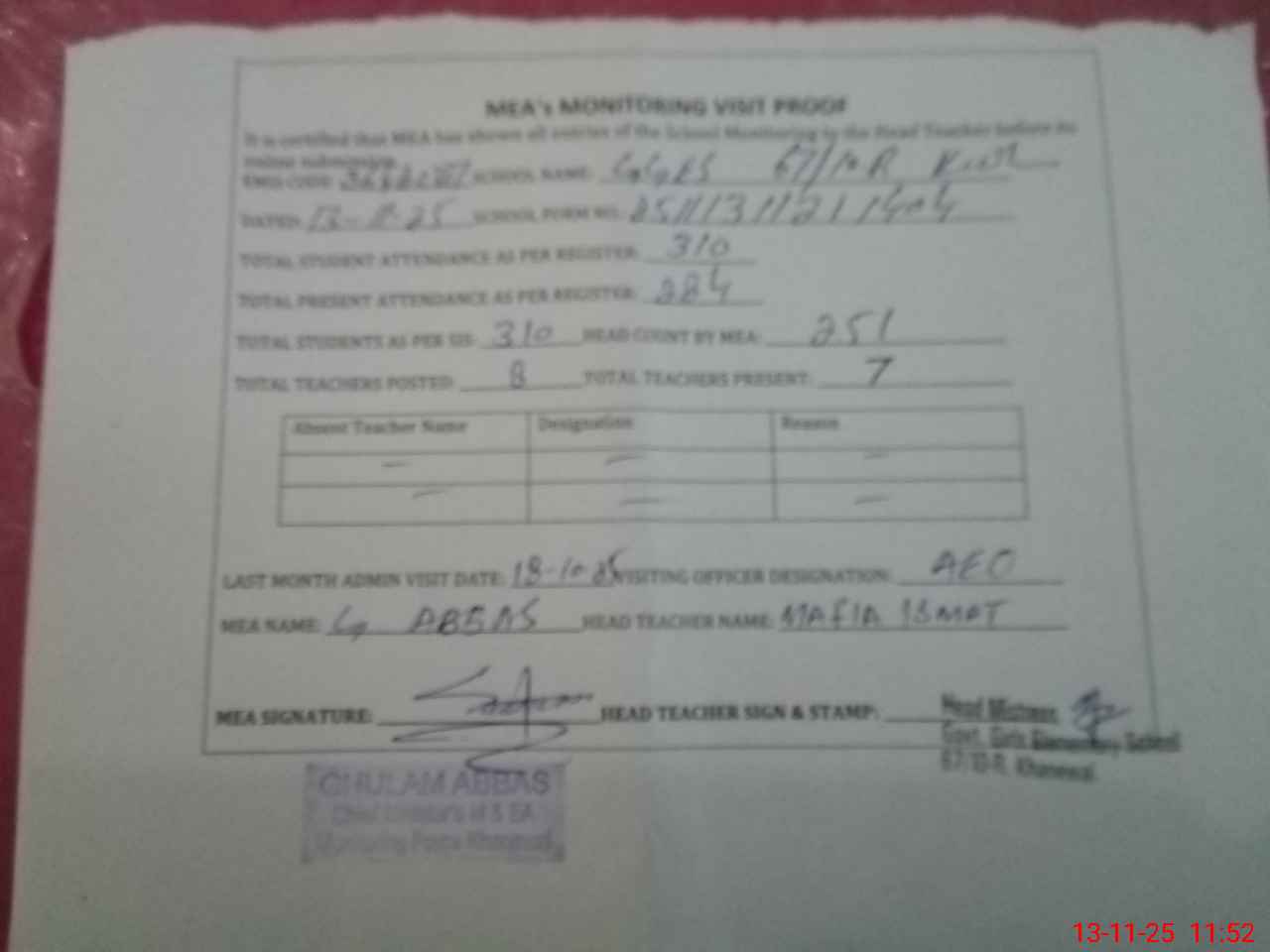 | Attendance Register | Head Teacher | MEA with School | Visit Proof |