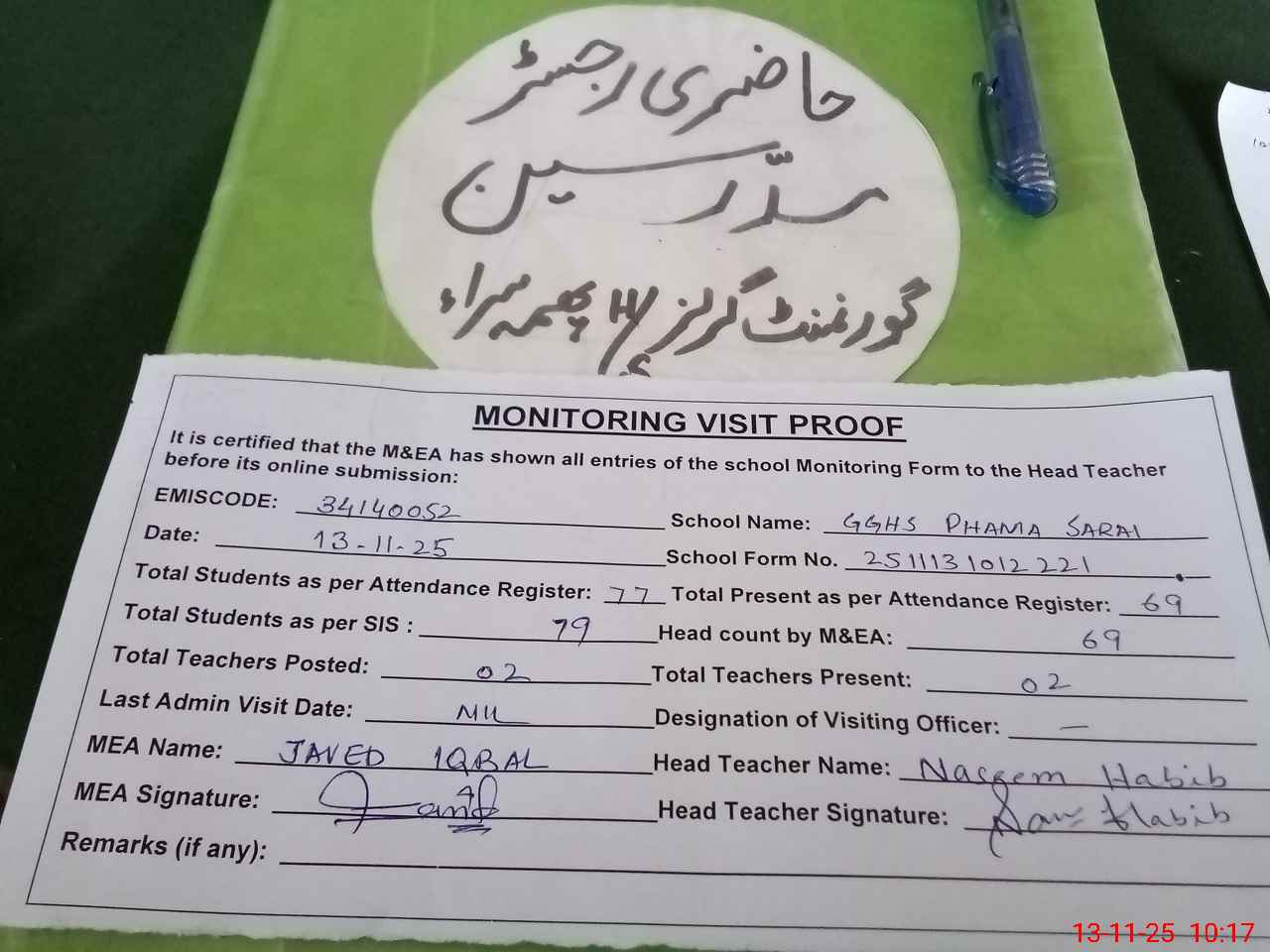 | Attendance Register | Head Teacher | MEA with School | Visit Proof |
