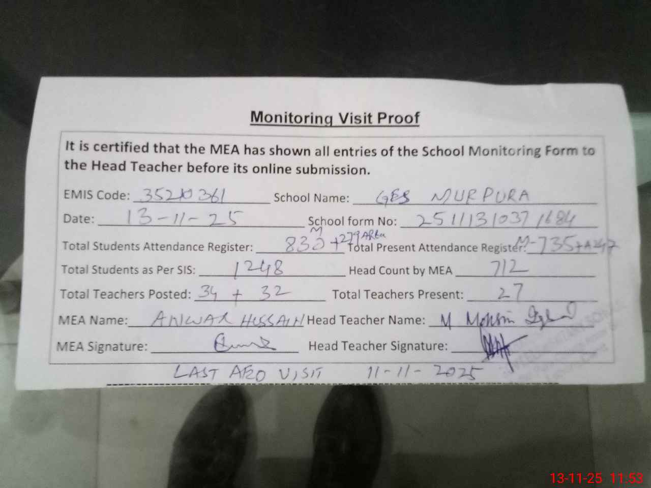 | Attendance Register | Head Teacher | MEA with School | Visit Proof |