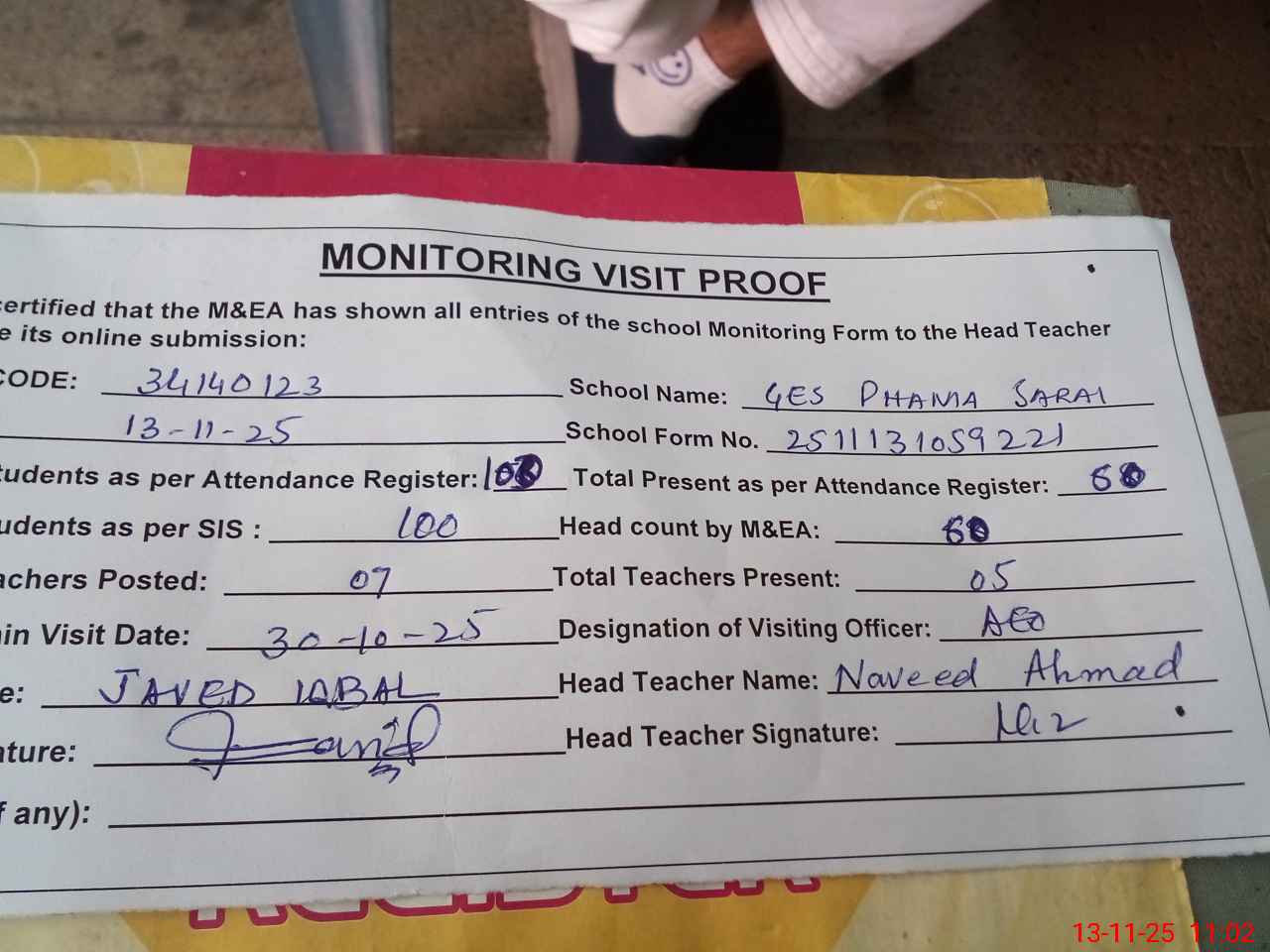 | Attendance Register | Head Teacher | MEA with School | Visit Proof |