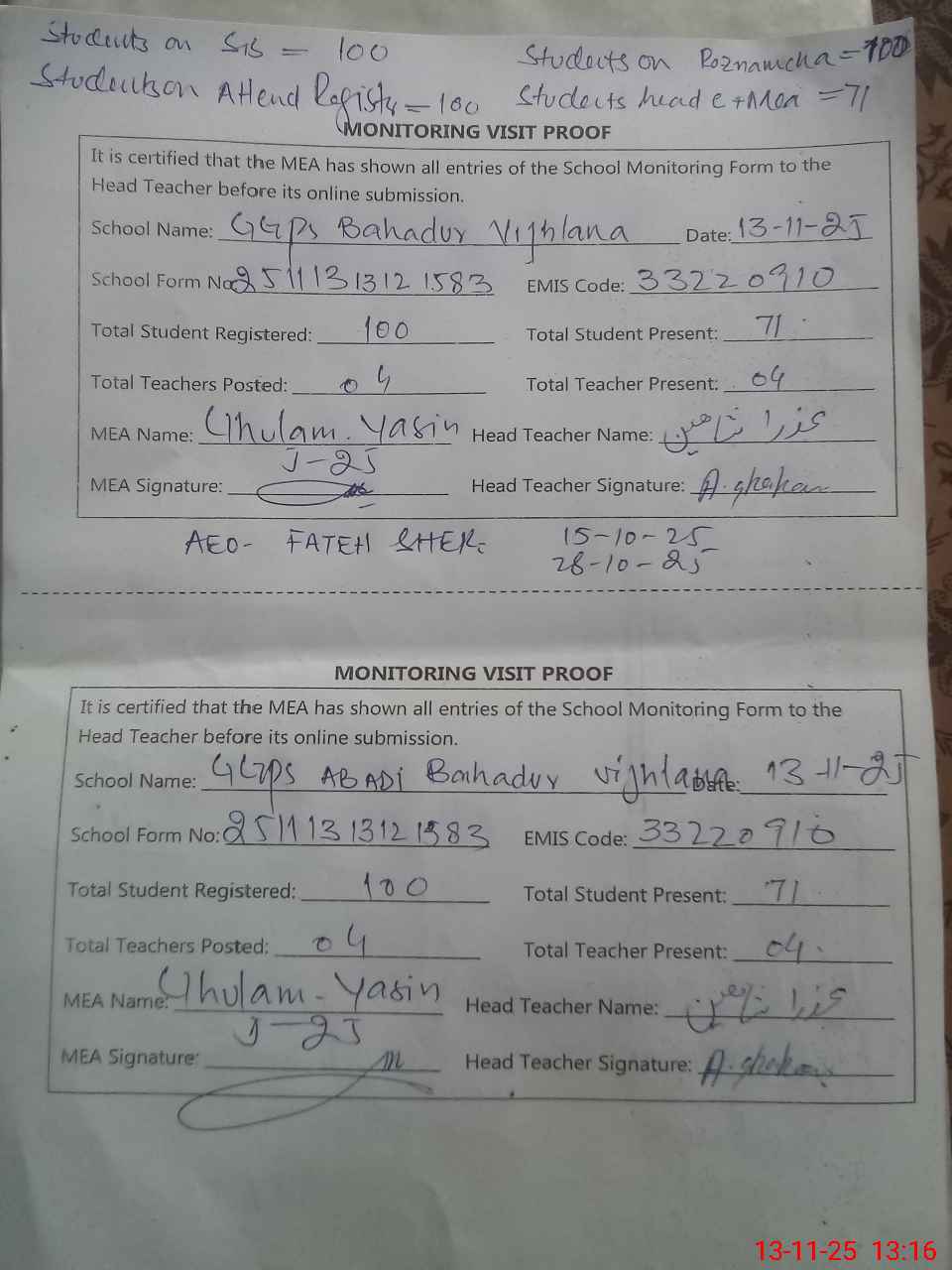 | EMIS Code: 33220910 | Name of School: GGPS ABADI BAHADAR VIJHLANA | |||
