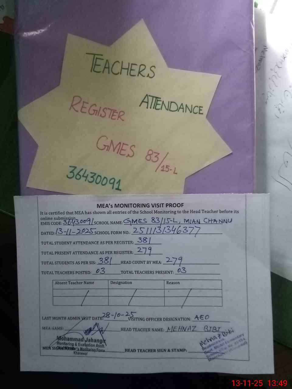 | Attendance Register | Head Teacher | MEA with School | Visit Proof |