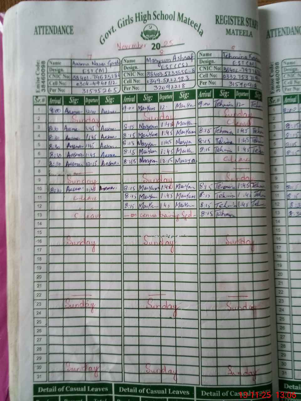| CNIC | Full Name | Designation | R/C | Absence during last cal. month |