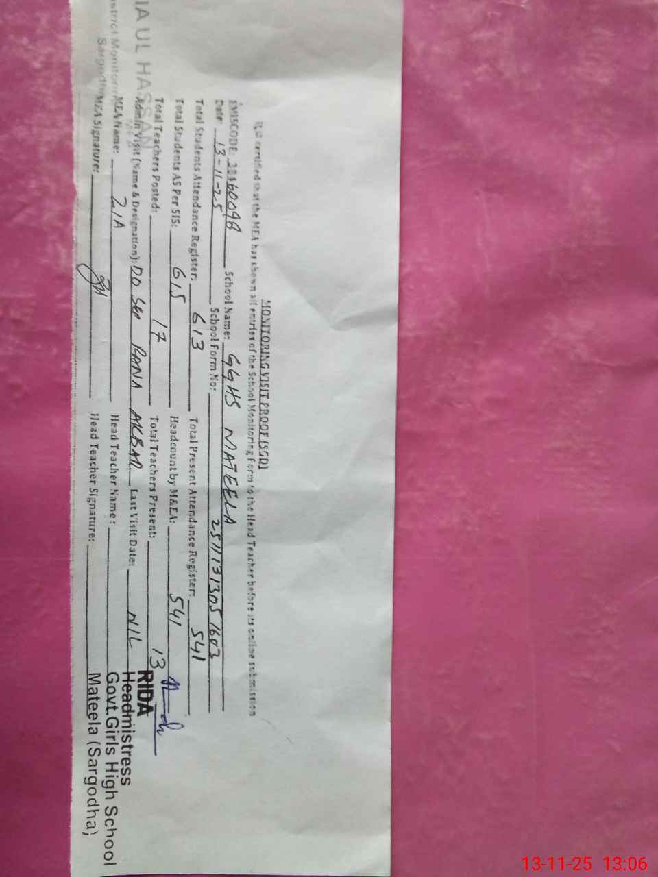 | Name: Ri**** Designation: (School Headmaster's/Headmistress's) Inch Headmisstress Phone/Cell Number: 03**** |