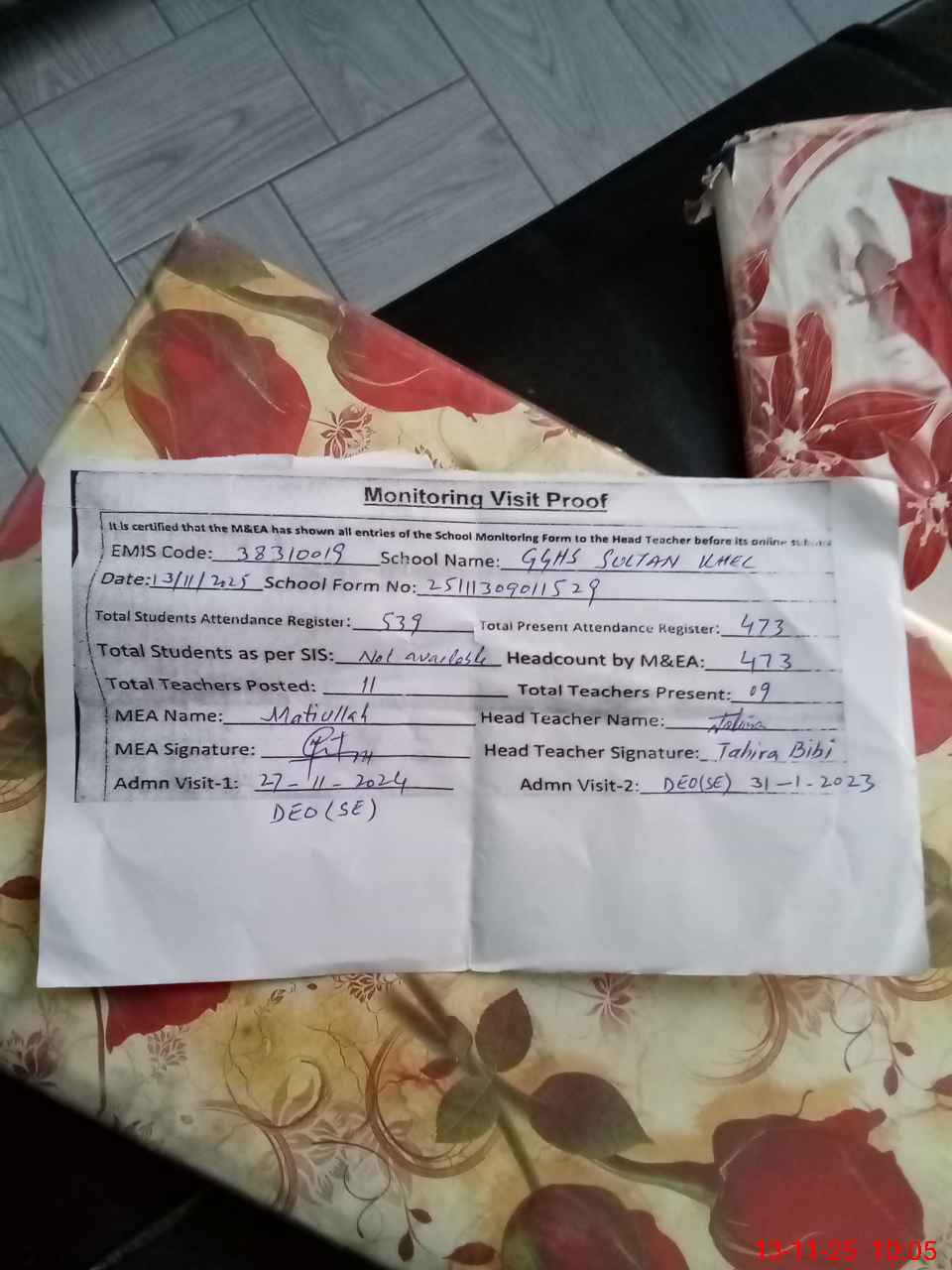 | EMIS Code: 38310019 | Name of School: GGHS SULTAN KHEL | |||